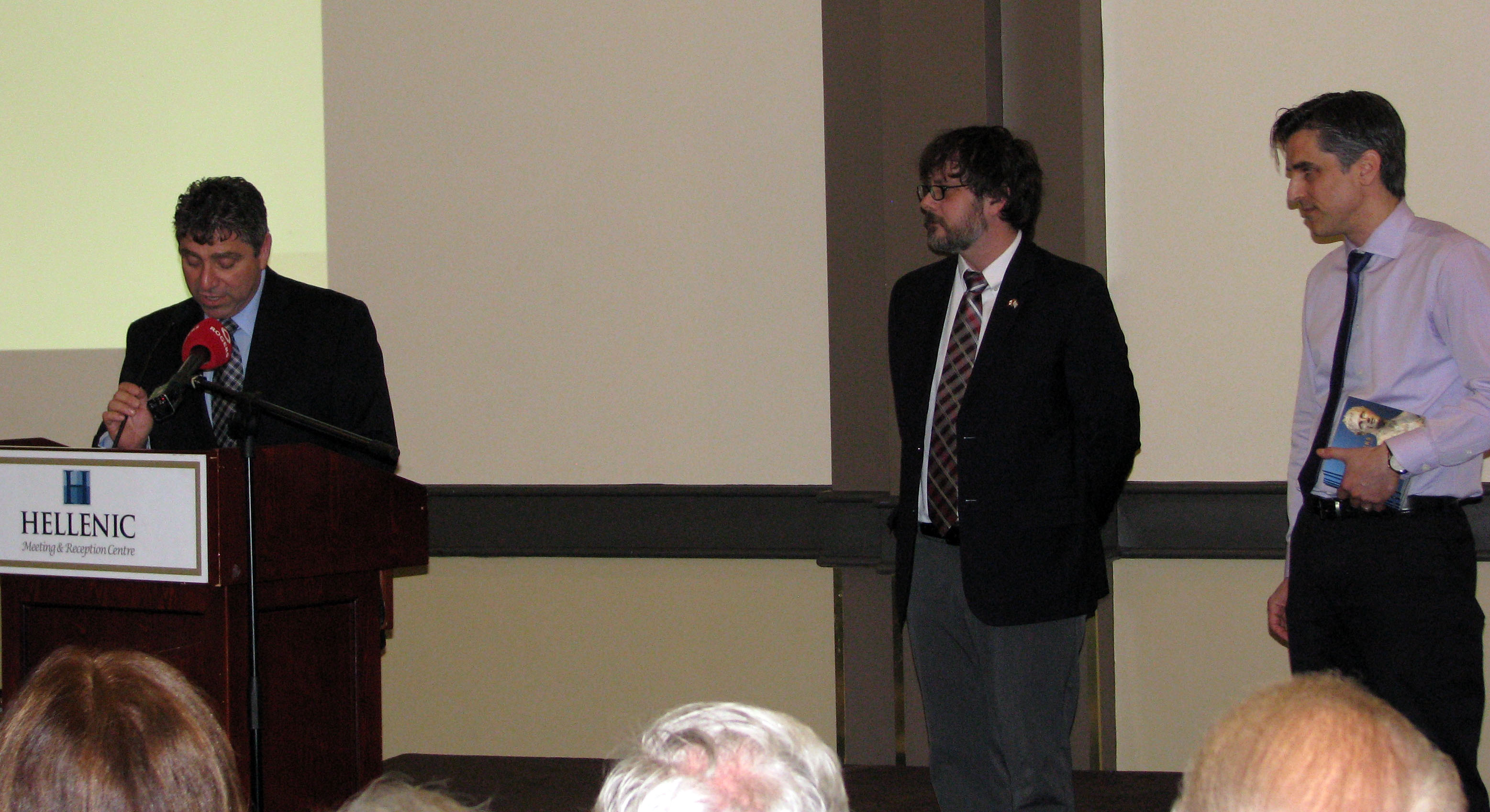 Presentation by Dr. Terrence Clark (center), Curator at the Museum of History on the occasion of the Museum exhibit titled "The Greeks: Agamemnon to Alexander the Great" (May 2019). Nick Lafkas, President of the Hellenic Community of Ottawa at the podium introducing the speaker and Dennis Trigylidas, Treasurer of Parnassos looking on.